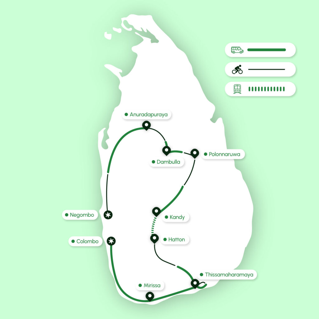 Travel from the laid-back shores of Negombo through the sacred cities of Anuradhapura and Kandy, explore the once-restricted northern region of Jaffna, relax on Trincomalee’s beaches, and finish in the bustling capital of Colombo — guided by knowledgeable locals every step of the way.
